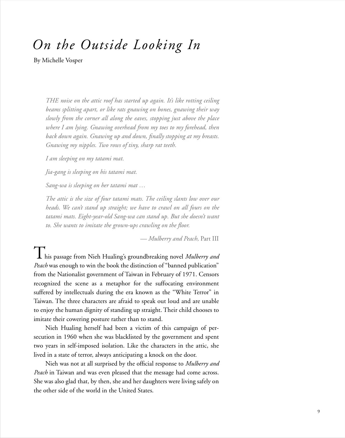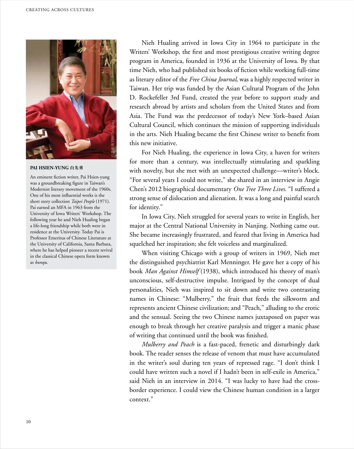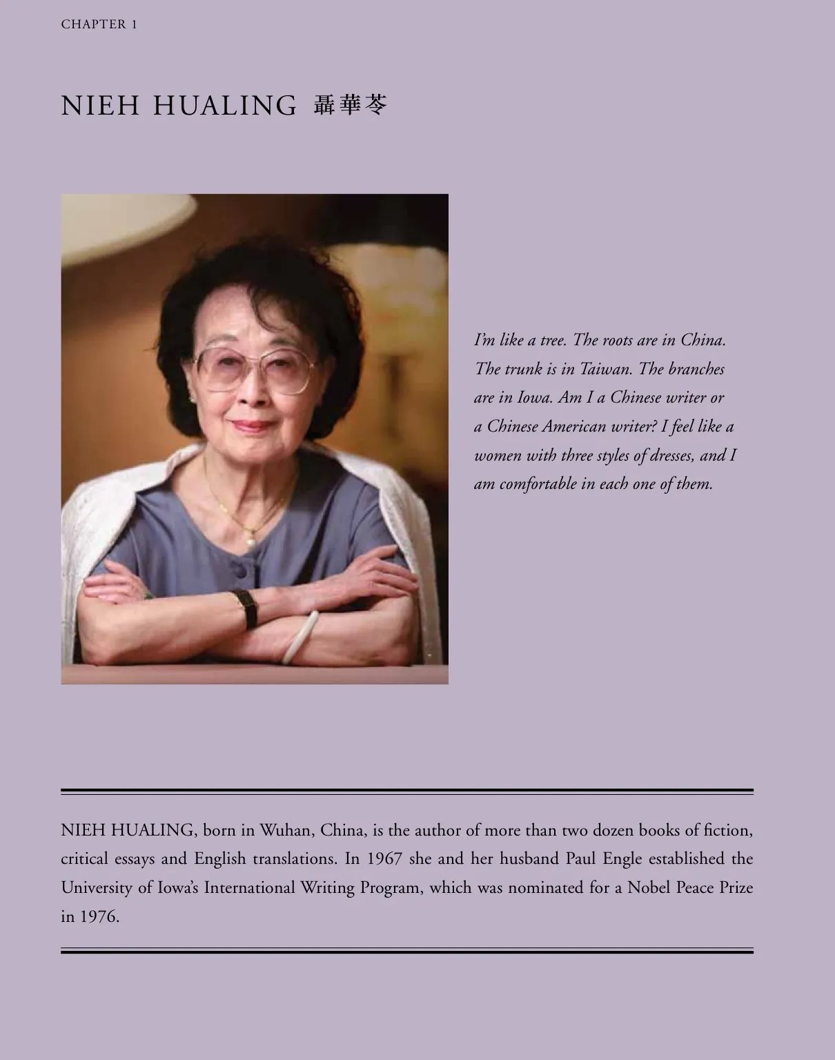 NIEH HUALING, born in Wuhan, China, is the author of more than two dozen books of fiction, critical essays and English translations. In 1967, along with her husband Paul Engle, she established the University of Iowa’s International Writing Program, which was nominated for a Nobel Peace Prize in 1976.